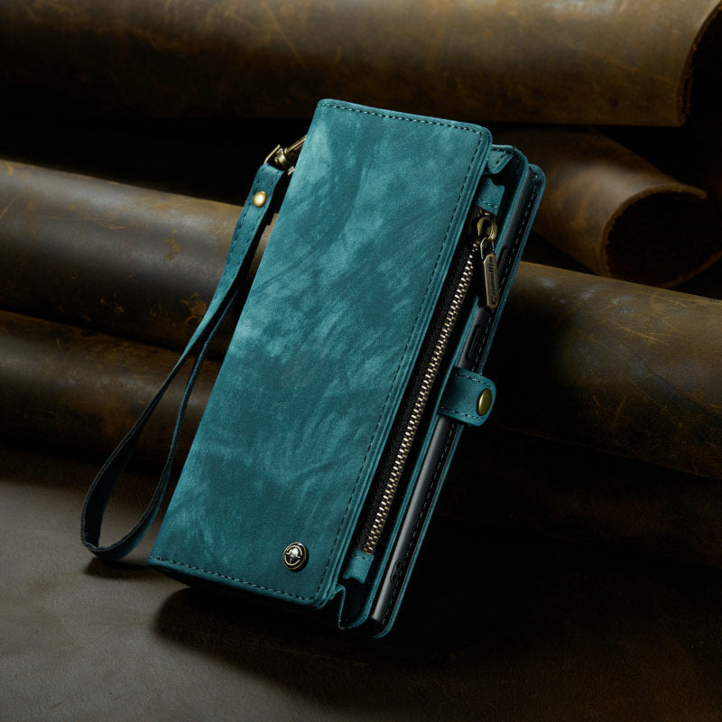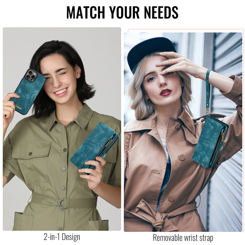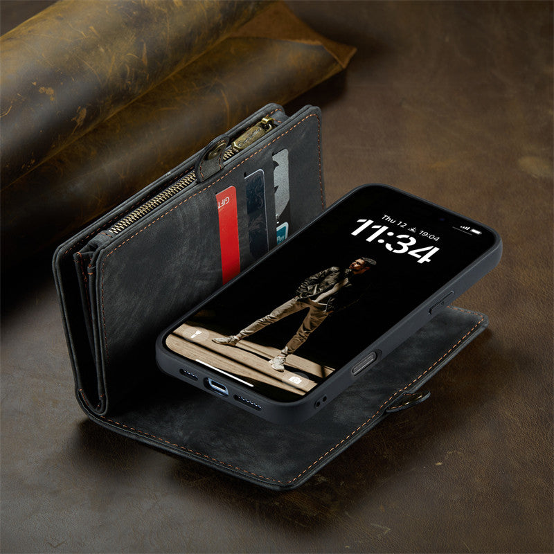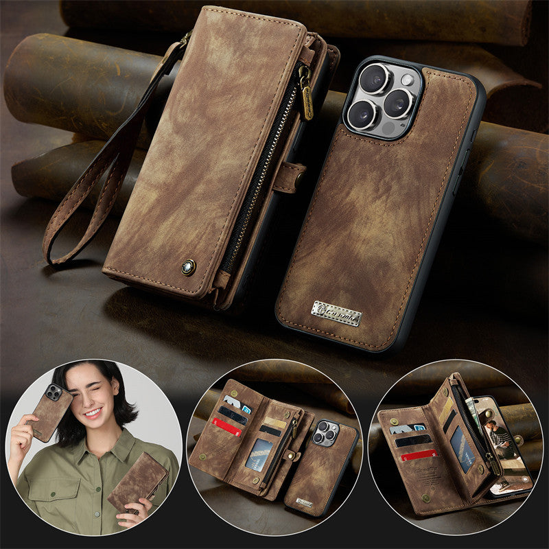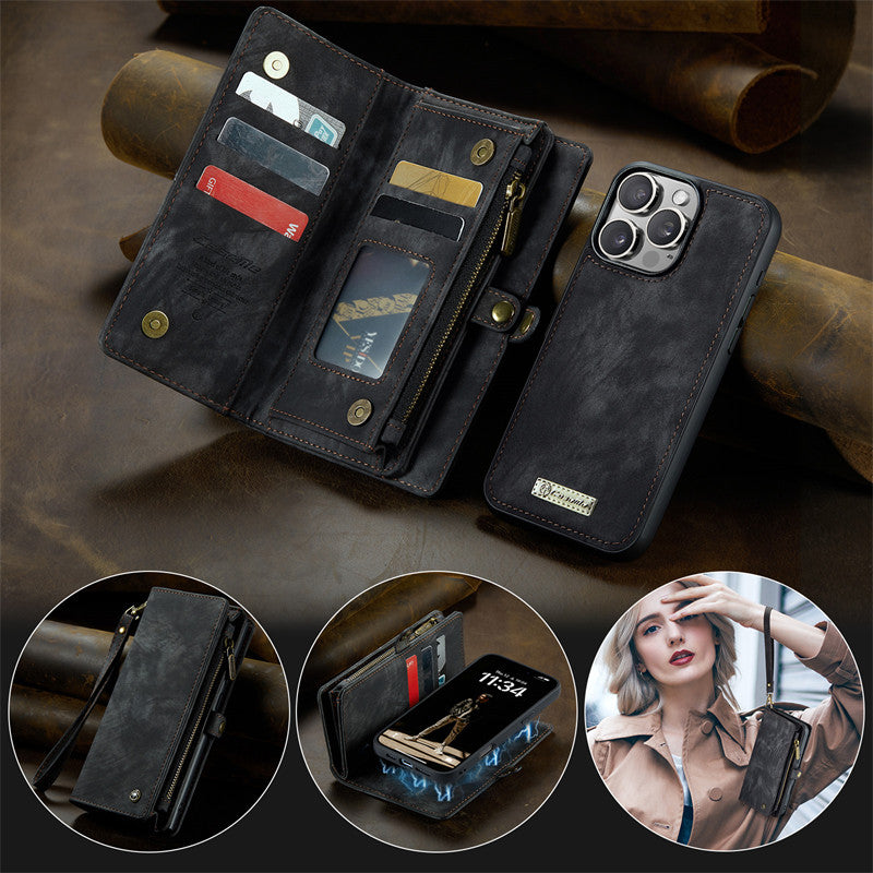 CaseMe Luxury Retro Leather Case for iPhone 13Pro Max Wrist Strap Wallet Case Card Pocket Black Blue Red Coffee Pink